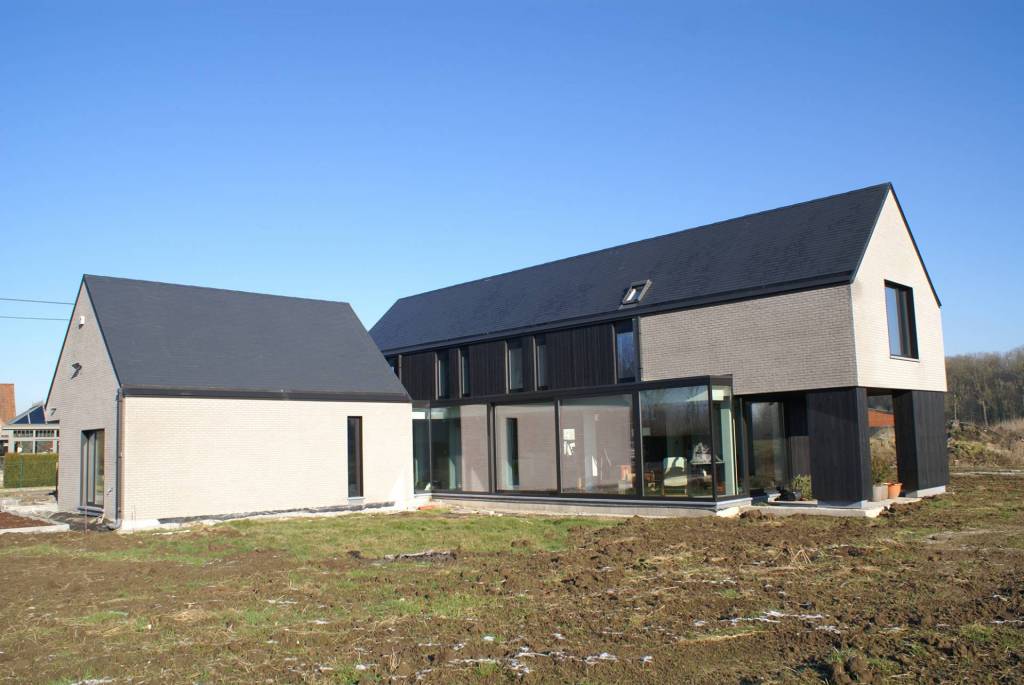 Ce parti architectural, outre son clin d’œil aux fermes d’autrefois, ouvre grandement l’habitation sur les environs champêtres tout en préservant une grande intimité des lieux. Il permet également à la lumière d’entrer en masse et d’augmenter les apports solaires.