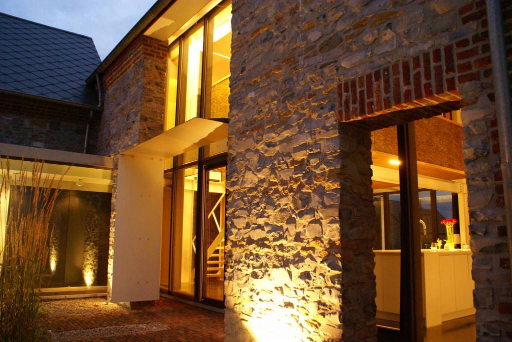 Il s’agit d’un projet de rénovation d’un ancien corps de ferme donnant sur la place du village. Le projet offre deux parties pour l’habitation privée et une activité professionnelle. L’ensemble est pensé comme un tout où les ouvertures originelles de la grange sont sublimées par des éléments contemporains. En effet ceux-ci ouvrent ou ferment la façade en fonction de l’utilisation des pièces.
